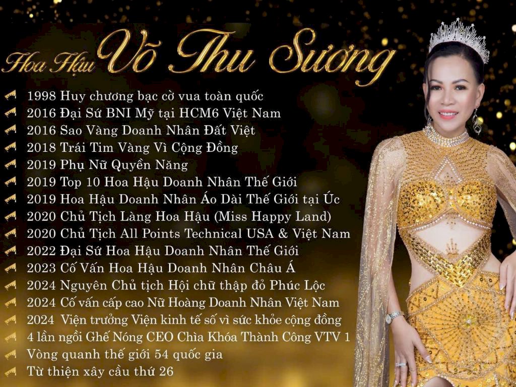 Võ Thu Sương là một nữ doanh nhân thành đạt, hoa hậu nhân ái, đại sứ văn hóa Việt Nam trên trường quốc tế, đồng thời là người phụ nữ truyền cảm hứng với hành trình đi qua 60 quốc gia để quảng bá hình ảnh Việt Nam và cống hiến cho xã hội.