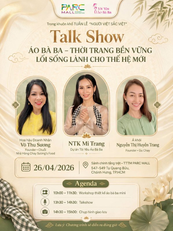 Talkshow sẽ diễn ra vào ngày 26/04/2026 tại sảnh chính tầng trệt Parc Mall (547–549 Tạ Quang Bửu, Chánh Hưng, TP.HCM). Ngoài phần chia sẻ, chương trình còn có workshop thiết kế áo bà ba mini, giao lưu và chụp hình cùng khách mời.