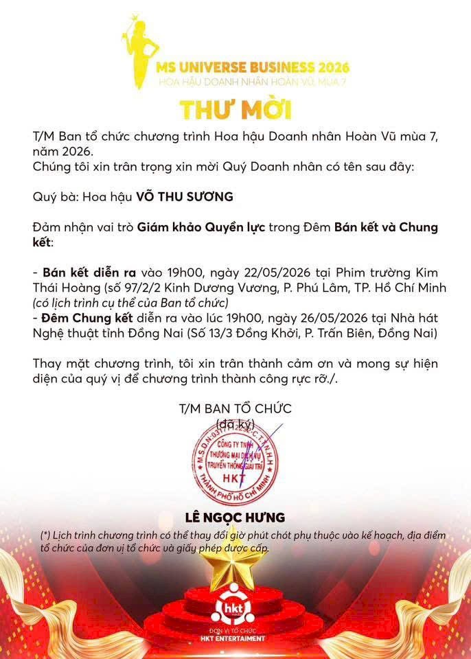 Không chỉ được biết đến với danh hiệu hoa hậu, Võ Thu Sương còn là một doanh nhân thành công, nhà sáng lập balotuixach.com và chuỗi nhà hàng chay Sương Food. Chính sự kết hợp giữa nhan sắc, trí tuệ và kinh nghiệm thực tiễn đã giúp chị trở thành lựa chọn đáng tin cậy của Ban Tổ Chức.